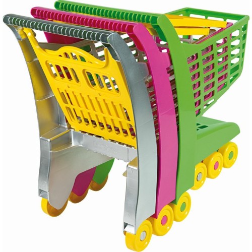 Тележка выполнена из высококачественного пластика, произведенного в Италии — прочная и устойчиво стоящая. Цвет — сдержанный серый с акцентами, что делает модель универсальной и стильной, подходящей как для игры дома, так и на улице. На удобной ручке малыш легко толкает тележку, а колёса обеспечивают плавное движение по разным поверхностям. Внутри корзины — вместительное пространство для игровых «покупок». Особое сиденье предназначено для куклы или мягкой игрушки: она присаживается рядом с ребёнком-покупателем и участвует в игре.
