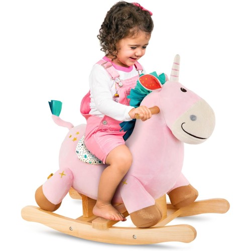 Запрыгивайте на этого мягкого единорог и держитесь крепче! Эта классическая игрушка идеально подходит для детской или игровой комнаты любого малыша. Сиденье очень удобное, а ручки из натурального твердого дерева делают эту игрушку прочной. Шарик внутри издает звонкий звук при движении! (Батарейки не нужны.)