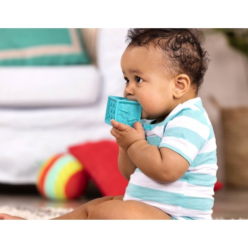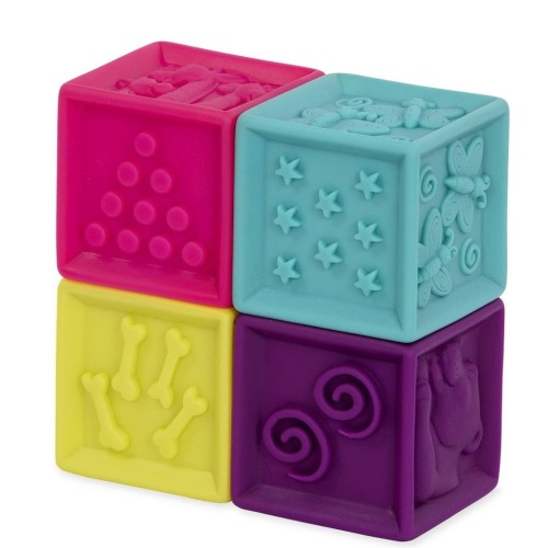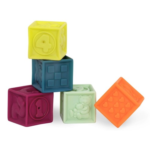 Десять супермягких и суперярких кубиков B. созданы специально для маленьких детских ручек. Все стороны кубиков абсолютно разные, на них изображены цифры от 1 до 10, животные, предметы и узоры. Благодаря фактурной поверхности, игра с кубиками прекрасно развивает мелкую моторику ребенка. Кубики из мягкого пластика можно грызть, их очень легко сжимать, с ними можно купаться. Упаковкой служит удобная сумочка.