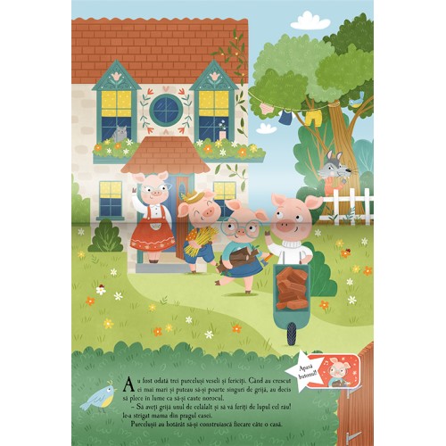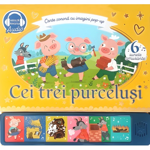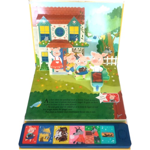 Эта интерактивная звуковая книга издательства Prut из коллекции «Звуковая книга с 3D-картинками» (Carte sonoră cu imagini pop-up) оживляет классическую сказку о трех поросятах с помощью объемных (pop-up) иллюстраций и звукового сопровождения. В книге рассказывается о трех поросятах, которые решают построить себе по дому, но за ними следит злой волк. Мир сказки оживает благодаря великолепным 3D-картинкам и включенным звукам. Читатели могут отсканировать QR-код, чтобы прослушать историю. Книга способствует развитию воображения и интереса к чтению.