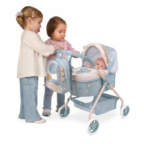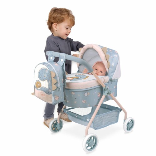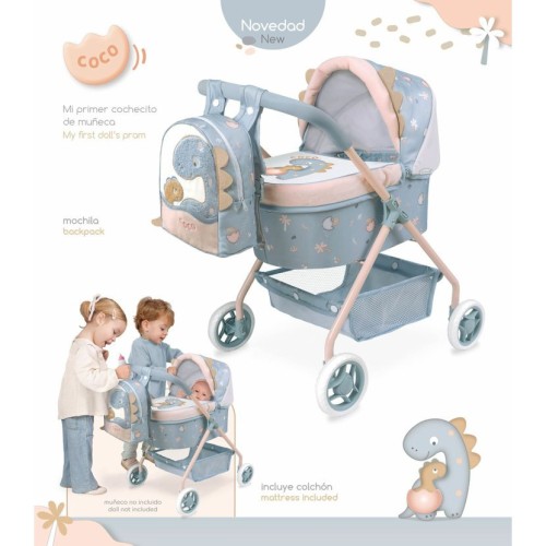 DeCuevas «Моя Первая Коляска для Кукол с Рюкзачком Coco» — это милая, стабильная и легкая коляска-люлька от испанского бренда DeCuevas Toys, новинка коллекции Coco 2024 года. Благодаря невысокой ручке 56 см, эта модель идеально подходит для самых маленьких, обеспечивая устойчивость и поддержку во время ходьбы. Коллекция Coco отличается забавным и современным дизайном с дружелюбным динозавриком, который понравится как девочкам, так и мальчикам. Основная ткань — нежная голубино-серая с милым принтом маленького динозаврика. Дизайн дополняют элементы песочного или розоватого цвета, которые также используются в конструкции шасси. Главный принт — изображение мамы-динозавра с ее милым детенышем, который еще несет на попке яичную скорлупу. Коляска отличается великолепным испанским дизайном и прецизионным исполнением, характерным для бренда DeCuevas.