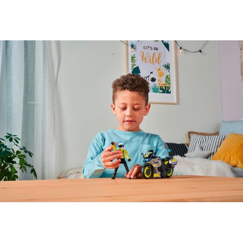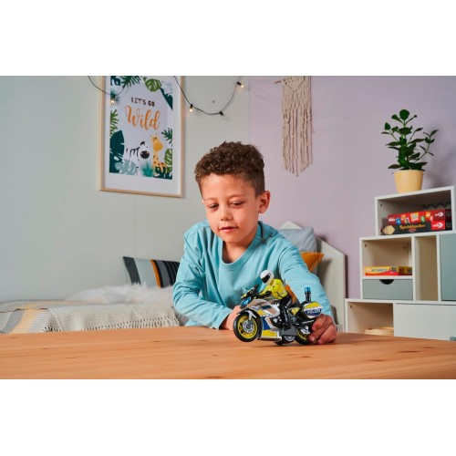 - Фигурка Полицейского: В комплект входит съемная фигурка полицейского, которая имеет шарнирные (подвижные) ноги, сгибающиеся в коленях, чтобы фигурка могла удобно сидеть на мотоцикле.