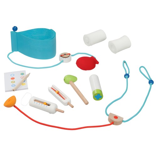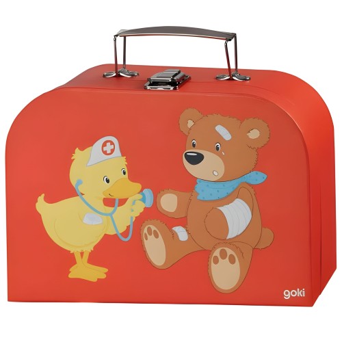 Сумка врача от GOKI содержит всё необходимое для проведения обследований и постановки диагноза больным пациентам. Медицинские аксессуары, такие как стетоскоп, шприцы, тонометр, молоточек и повязки, аккуратно размещены в красном чемоданчике, который можно взять с собой в любое место. Все элементы сумки марки GOKI легкие и тщательно выполнены, благодаря чему игра в врача станет еще более увлекательной!
