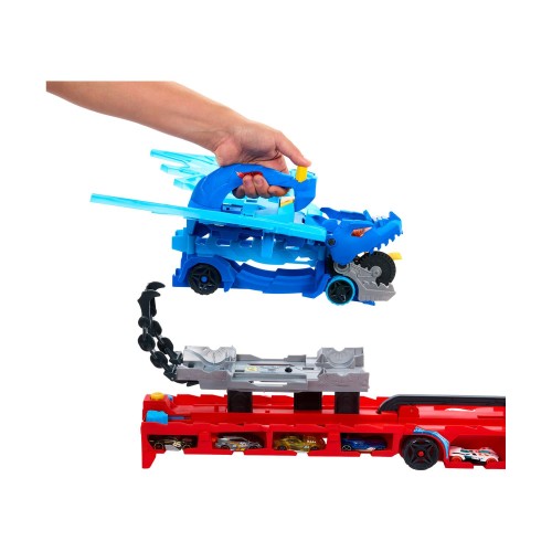 Приготовься к невероятным приключениям с Hot Wheels City – Ultimate Dual Dragon Transporter! Этот гигантский грузовик-дракон не просто перевозит машинки — он превращает игру в настоящее шоу с захватывающими гонками и яркими трюками. Дети могут запускать машинки прямо с головы и хвоста дракона, устраивая зрелищные гонки. Транспортёр вмещает до 20 машинок Hot Wheels (масштаб 1:64), позволяя легко хранить и брать коллекцию с собой. Огненные драконьи детали и динамичный дизайн делают набор особенно эффектным.