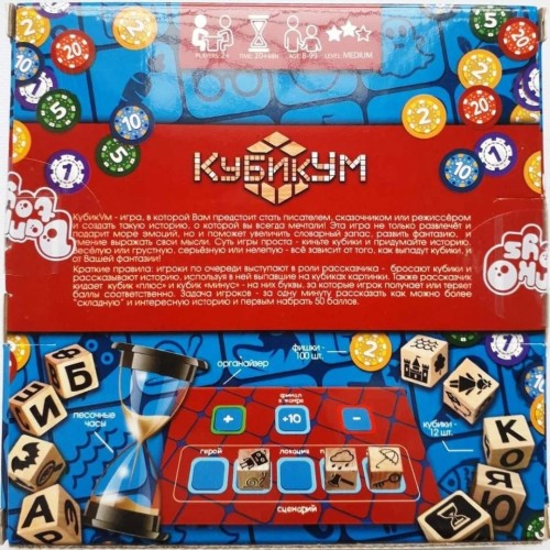 "КубикУм" – это динамичная настольная игра для 2 и более игроков от 8 лет, которая превращает развитие фантазии и ораторского мастерства в увлекательное состязание. Ваша цель – первым набрать 50 баллов, придумывая и рассказывая за 1 минуту оригинальные истории!