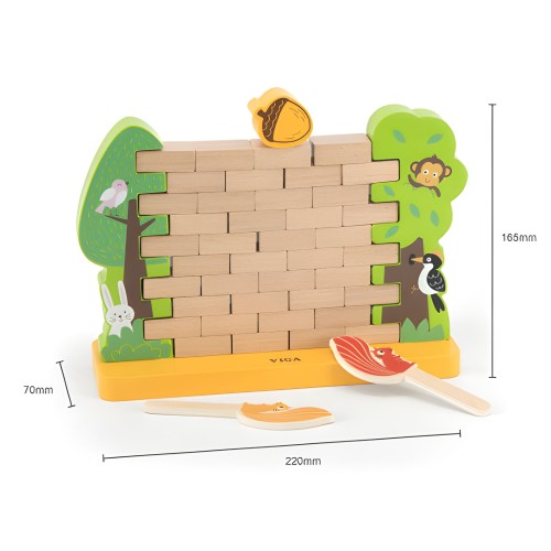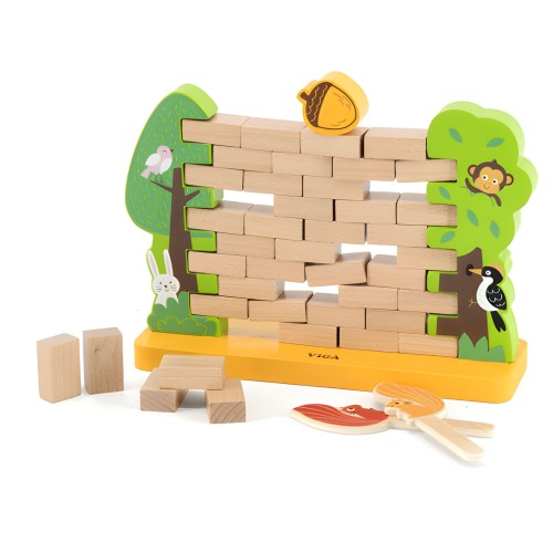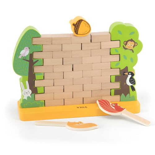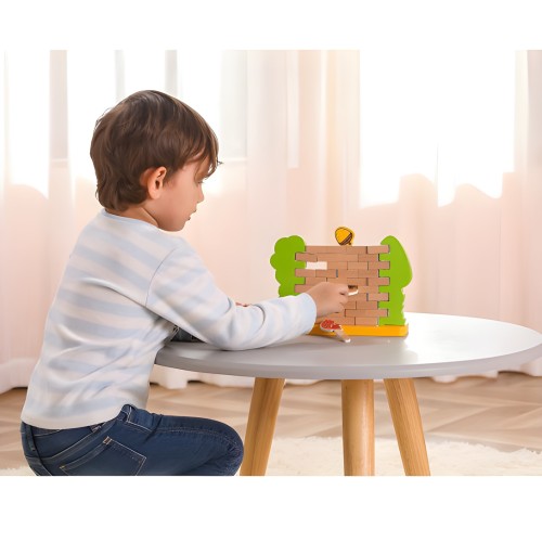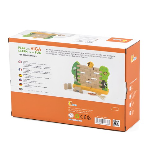 „Zidul de Cărămizi” de la Viga Toys este un joc de masă din lemn, captivant și plin de suspans, ideal pentru petrecerea timpului liber în familie și pentru dezvoltarea abilităților cheie la copii. Jocul, bazat pe principiul Jenga, începe cu construirea în comun a zidului. Apoi, jucătorii iau pe rând bețișoare speciale (setul include două bețișoare) și încearcă să împingă cu grijă o cărămidă din zid. Obiectivul principal este să nu cadă ghinda, care stă așezată pe vârf! Setul conține 44 de elemente (o bază, 40 de cărămizi, 2 bețișoare și 1 ghindă) și este fabricat din lemn șlefuit fin, folosind vopsele sigure pe bază de apă. Jocul antrenează excelent îndemânarea mâinilor, acuitatea vizuală, concentrarea atenției și gândirea logică, forțând copilul să cântărească fiecare acțiune. Dimensiunile zidului asamblat sunt de aproximativ 22 x 7 x 17 cm.