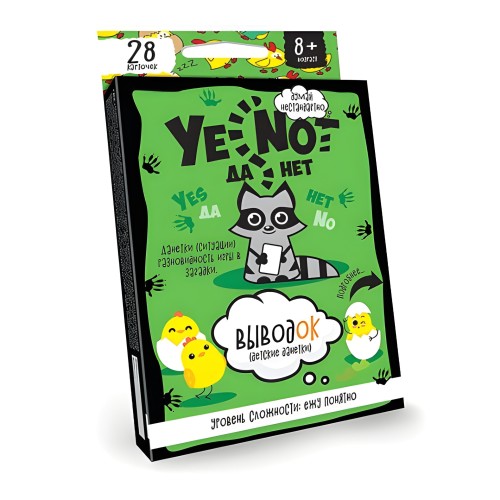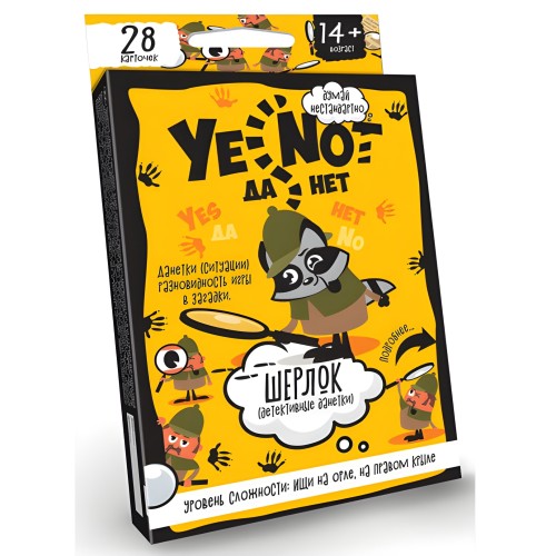 Карточная игра "ДА-НЕТ" с милым Енотом – это увлекательная детективная игра-головоломка, идеально подходящая для компании от 2 человек и детей от 6–8 лет. Суть игры проста: разгадать загадочные истории, задавая Ведущему вопросы, на которые можно получить только ответы: "Да", "Нет" или "Не имеет значения"!