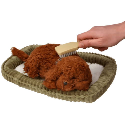 Jucăria se distinge prin blana sa albă ca zăpada (sau crem), elegantă și ușor ondulată, realizată din 100% fibră sintetică, care este incredibil de plăcută la mângâiat. Cățelușul se remarcă prin imitația realistă a respirației – burtica i se ridică și coboară blând și silențios, creând iluzia completă a unui Toy Poodle care doarme liniștit. La unele modele, respirația este însoțită de un efect sonor liniștitor de „pufăit” (snoring sound), ceea ce sporește senzația de prezență a unui animal de companie viu.