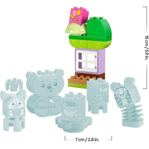 Комплект: Включает фигурки Винни-Пуха, Пятачка, Тигры и Иа, праздничный торт, подарки и кубики DUPLO;
