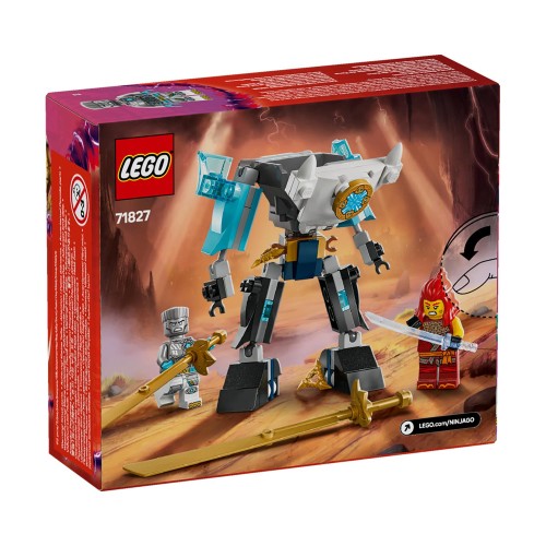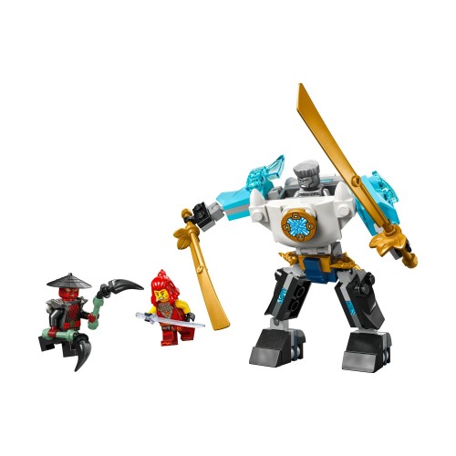 Набор LEGO NINJAGO: Боевой костюм Зейна— это небольшой игровой набор из 92 деталей, предназначенный для детей от 6 лет, чтобы разыгрывать сцены из 3-го сезона телешоу NINJAGO: Восстание драконов. Центральной моделью является подвижный боевой робот Зейна, выполненный в его традиционных белых, голубых и черных тонах. Робот имеет шарнирные руки, ноги, кисти, а его верхняя часть корпуса вращается на 360 градусов, что позволяет принимать различные боевые позы. В грудной части робота расположена открывающаяся кабина для минифигурки Зейна. В руках мех держит два больших меча. В набор входят три минифигурки: Зейн с двумя сюрикенами, Уайлдфайр с кристаллической катаной и злодей Дрикс, Мастер Роя из Запретной Пятерки, с двумя серпами. Собранный робот имеет высоту более 10 см.