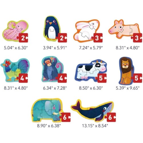Набор пазлов «Животные» от Mideer — это идеальная игра для малышей, помогающая им развивать логическое мышление, моторику и навыки решения проблем. Набор содержит 10 пазлов с изображениями домашних и диких животных, каждый с разным количеством деталей: от 2 до 6. Таким образом, дети могут начинать с более простых пазлов и постепенно переходить к более сложным.