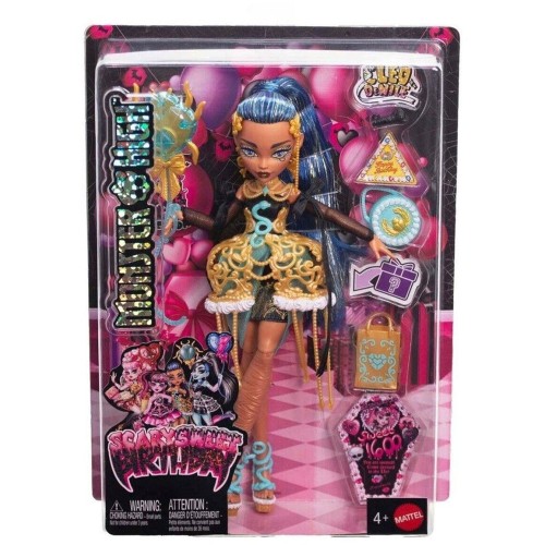 Уникальные элементы стиля, такие как черная „помада” и сумка в форме торта, заставляют детей и взрослых коллекционеров ждать чудовищного веселья, чтобы украсить Клео де Нил для вечеринки!