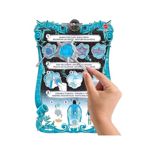 С чего начать? Используйте ключ с увеличительным стеклом, чтобы раскрыть символы на карте для сокровищ. Когда вы откроете дверцу шкафа, в сюрпризах, спрятанных внутри, вы найдете элементы с символами, соответствующими символам на карте. Эти предметы спрятаны среди аксессуаров, идеально подходящих для выхода на красную ковровую дорожку. Сложите все три части в талисман. Закрепите талисман у основания шкафа, а затем сдвиньте его вверх, как слайдер, чтобы открыть куклу Фрэнки Стейн в электризующем стиле! Этот удивительный момент можно повторять снова и снова!