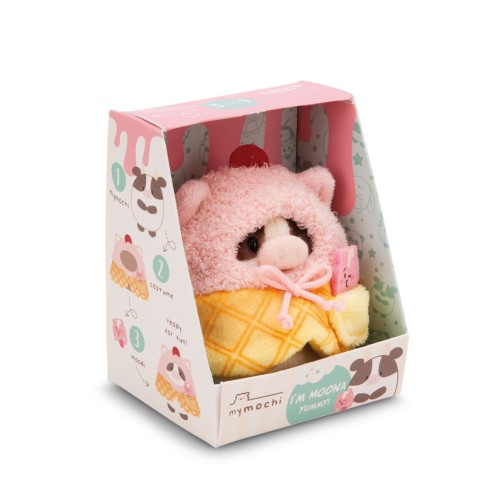 Коровка одета в пушистый розовый костюм, напоминающий вкусное мягкое мороженое с вишенкой, и сопровождается «муди». Этот волшебный набор 3-в-1 упакован в подарочную коробку, содержащую информацию о её имени, характере, игровом концепте и других друзьях из коллекции mymochi.