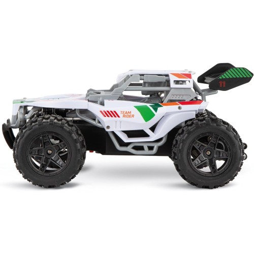 Этот багги оснащен всем необходимым для покорения сложной местности. Пневматические шины и полная подвеска обеспечивают отличное сцепление и позволяют Team Rider легко преодолевать камни, траву и другие препятствия. Благодаря технологии 2,4 ГГц, до 16 водителей могут соревноваться одновременно на полной скорости (до 12 км/ч), не беспокоясь о помехах.