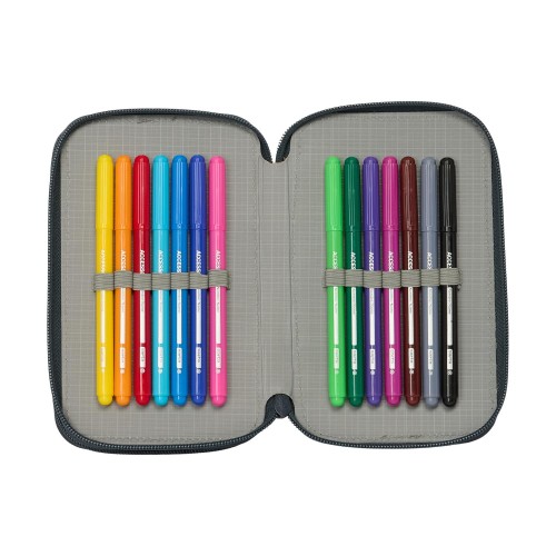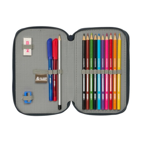Acesta este un penar școlar dublu echipat licențiat oficial de compania Safta cu simbolurile clubului de fotbal "Real Madrid", proiectat în stilul echipamentului de acasă pentru sezonul 25/26. Penarul are două compartimente separate cu fermoar, care vin complet dotate cu rechizite și conține 29 de piese.