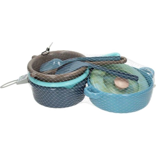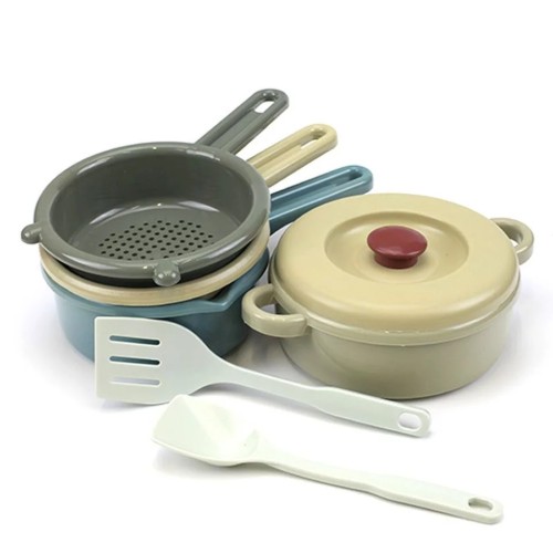 В наборе 7 предметов: кастрюля с крышкой, сковорода, кастрюля, сито, большая ложка, лопатка, маленькая ложка.