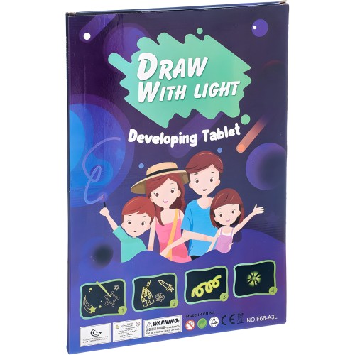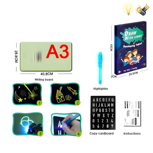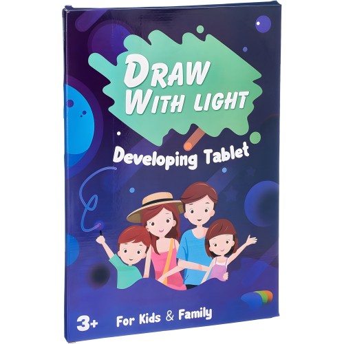 Безопасный Материал: Планшет и маркер изготовлены из безопасного пластика и не содержат фосфора или других вредных веществ. Маркер-фонарик имеет мягкий свет, безопасный для глаз.