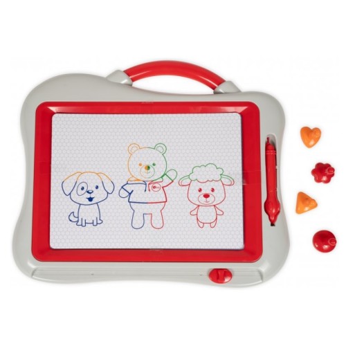 Магнитная доска для рисования знакомит ребенка с миром искусства! Просто возьмите магнитный карандаш и начните рисовать! А когда вы закончите работу, протрите доску и начните все сначала! Хотите сделать развлечения еще интереснее? Возьмите магнитные штампы и прижмите их к доске — на ней появятся разные забавные фигуры! Четырехцветный фон делает доску еще более особенной – рисовать на ней еще интереснее! Размер магнитной доски: 39х32 см.