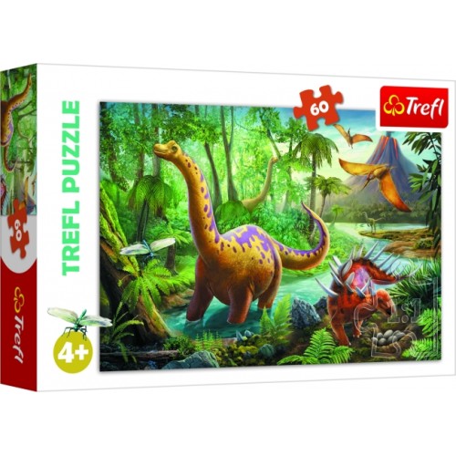 Этот пазл состоит из 60 деталей, что является идеальным уровнем сложности для детей от 4 лет и старше. Количество деталей обеспечивает умеренный вызов, стимулирующий развитие, но при этом гарантирует успешное завершение. На изображении, вероятно, представлена яркая и детализированная сцена с различными видами динозавров в их естественной среде обитания. Trefl гарантирует высокое качество печати и детали, изготовленные из плотного картона.
