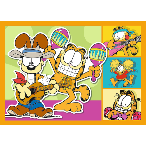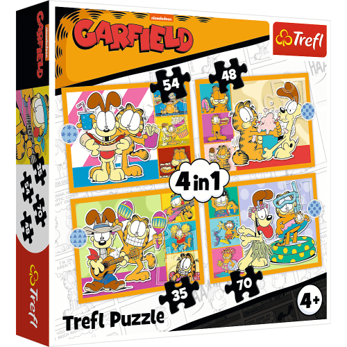 Этот набор - официальный лицензионный продукт, посвященный Гарфилду, который любит лазанью и ненавидит понедельники. Он включает в себя четыре отдельные головоломки с возрастающим уровнем сложности: 35, 48, 54 и 70 деталей. На каждой картинке изображены разные сцены с Гарфилдом, Оди и Джоном, полные юмора и забавных ситуаций. Trefl гарантирует яркие, насыщенные цвета и детали, изготовленные из плотного картона.