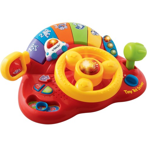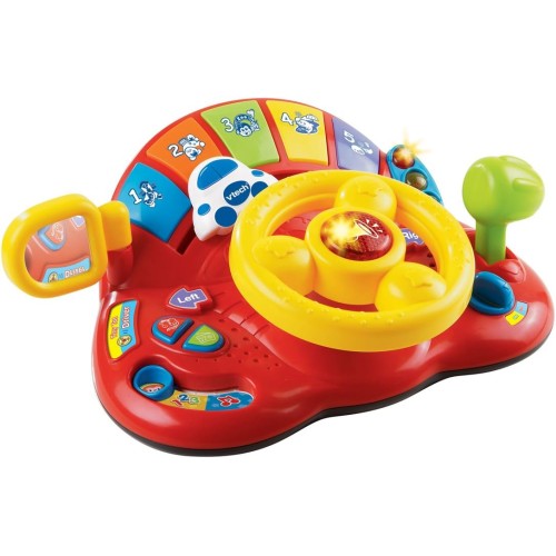 Эта модель VTech знакомит малышей с транспортными средствами и их реалистичными звуками, а также с цветами, числами и животными с помощью забавных фраз. Для музыкального развития и слухового восприятия игрушка включает более 60 песен, мелодий, звуков и фраз, в том числе 2 песни для подпевания и 10 мелодий. Включение светящейся кнопки звукового сигнала, рычага переключения передач и светящихся светофоров обеспечивает богатую сенсорную стимуляцию. Кроме того, в конструкцию включено небьющееся зеркало заднего вида, способствующее самопознанию малышей. Благодаря специальным ремням, игрушку можно легко и надежно прикрепить к коляске или столику стульчика для кормления, делая ее идеальной для игры в дороге.